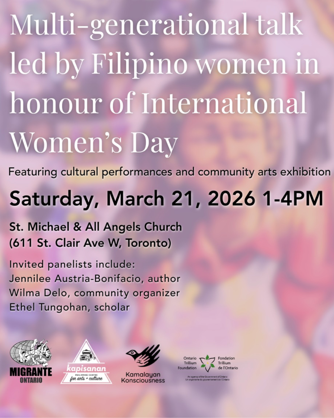 To mark International Women’s Day in 2026, Kapisanan, Migrante Ontario and Kamalayan Konsciousness are hosting a 2-hour in-person multi-generational talk with the moderator Waynes Manalang (radio host, activist) in conversation with Dr. Ethel Tungohan (researcher), Jennilee Austria-Bonifacio (writer), and Wilma Delo (community organizer, activist) about the status of migrant women in Canada and Filipino women in the Philippines. In this event, we’ll discuss the vulnerabilities of migrant women and the importance of collective action in upholding migrants' rights. Admission is free!